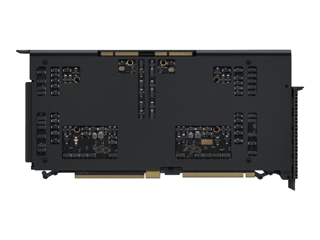 For grafikk i arbeidsstasjonklassen og krevende proffapper kan du velge Radeon Pro W6800X MPX-modulen med 32 GB GDDR6-minne som gir opptil 512 GBps minnebåndbredde. Du kan installere opptil to i Mac Pro med Infinity Fabric Link, slik at du får ytelsen fra to grafikkort til bruk i apper som Final Cut Pro. Dette grafikkalternativet har også databehandling på opptil 16 teraflops med enkel presisjon, eller 32 teraflops med halv presisjon. Den støtter opptil seks 4K-skjermer, tre 5K-skjermer eller tre Pro Display XDR-skjermer. Og MPX-modulen i full høyde fyller én MPX-skuff og bruker ekstra kraft og PCIe-båndbredde, slik at du får fire ekstra Thunderbolt 3-porter og én HDMI 2.0-port på kortet.