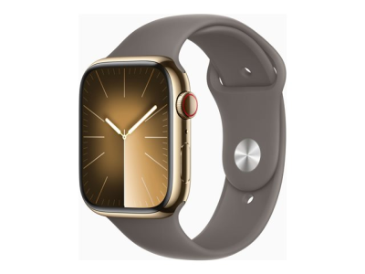 Apple Watch Series 9 (GPS + Cellular) - 45 mm - gyllen rustfritt stål - smartklokke med sportsbånd - fluorelastomer - leire - båndbredde: M/L - 64 GB - Wi-Fi, Bluetooth, UWB, LTE - 4G - 51.5 g MRMT3DH/A