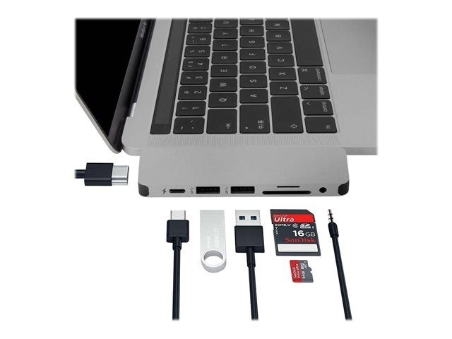 Form-fitting USB-C Hub for MacBook Pro and Air. This USB-C docking station attaches to MacBook adding 8 ports: 4K HDMI output, USB-C power delivery, and more.