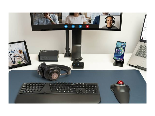 Kensington's Universal 3-in-1 Pro Audio Headset Switch allows professionals to use their favorite wired or wireless headset (Bluetooth, USB-C, USB-A, or 3.5 mm) as they switch between different devices (laptops, phones, and tablets). Accommodates up to three different audio sources, automatically remembers previously paired devices, eliminates the need for multiple headsets, and works with Microsoft Teams, Google Meet, Zoom, WebEx, and more.
